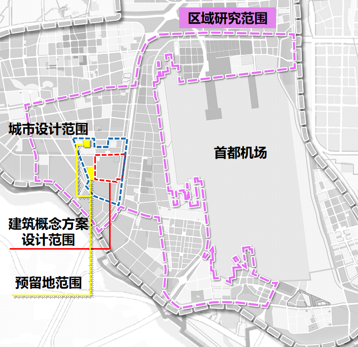 (3)區域研究:在臨空經濟示范區轉型升級的大背景下,結合周邊存量土地資源的改造利用,重點在功能布局、公共空間構建、景觀塑造、交通體系等方面提出優化意見和意向方案。研究范圍約3182公頃。